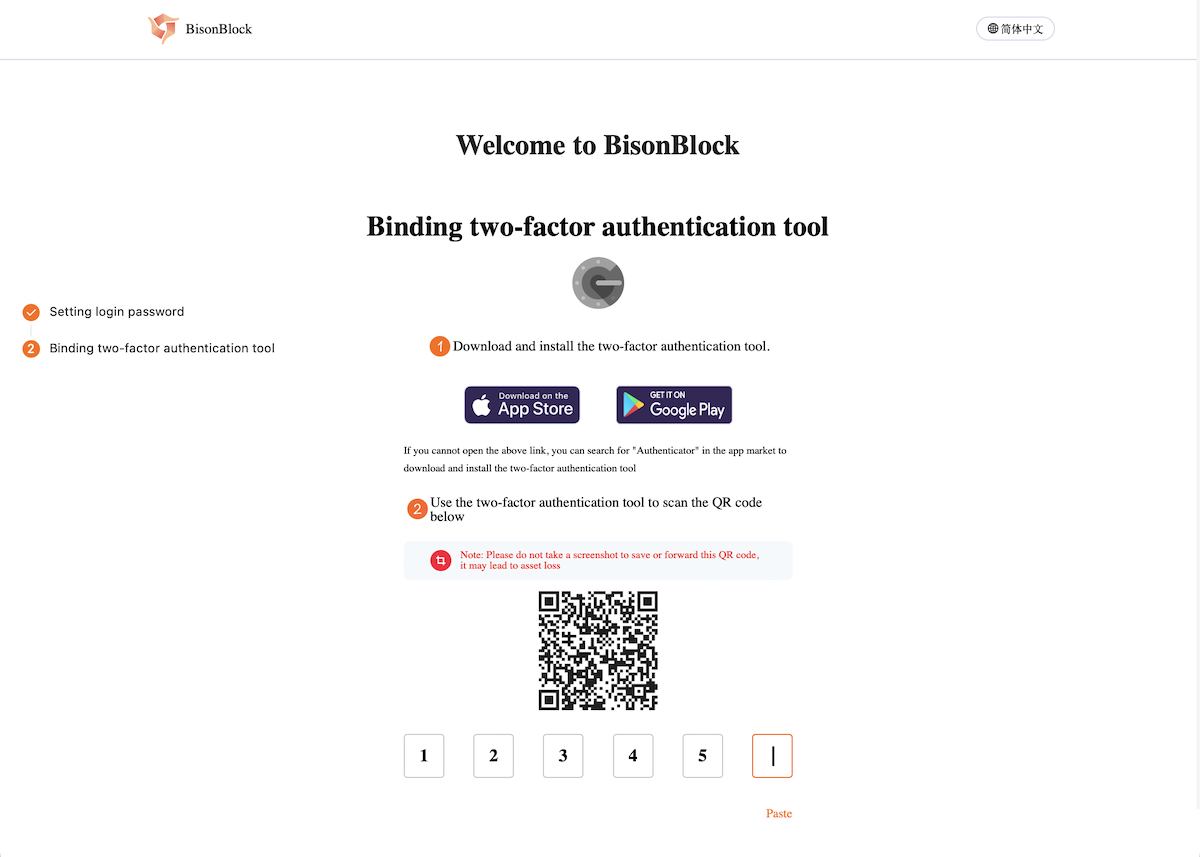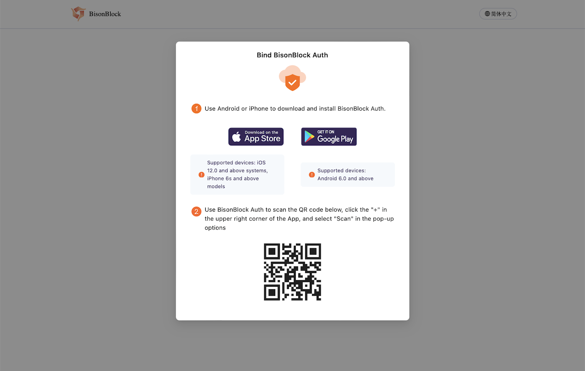 After setting up your password and 2FA, you will be asked to bind with BisonBlock Auth app. You must open the BisonBlock Auth app to scan the QR code, other than other tools like Google Authenticator.