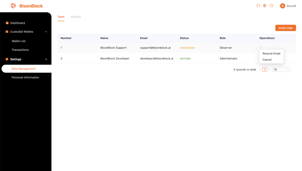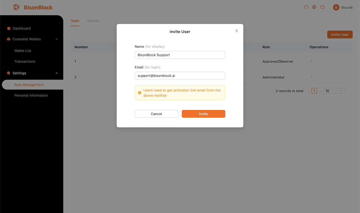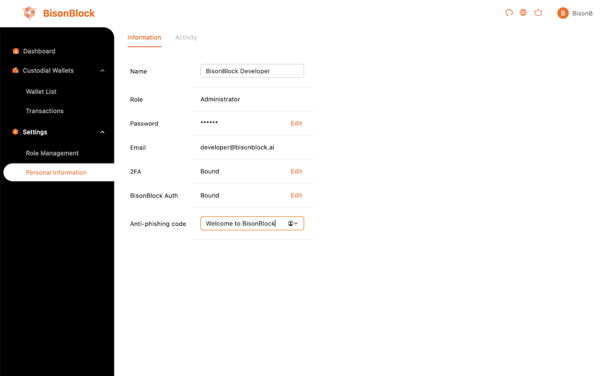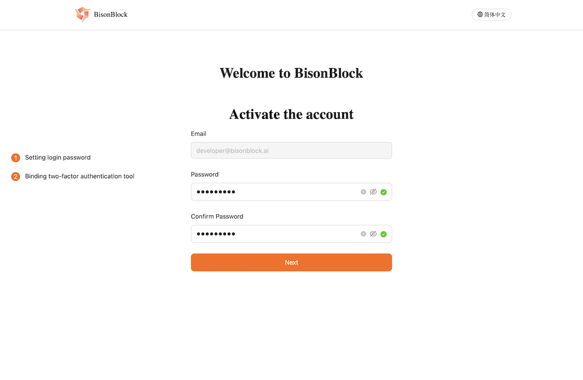 After your account is created, you will be the first admin, and you must active your account by setting up your 2FA tools and BisonBlock Auth app.